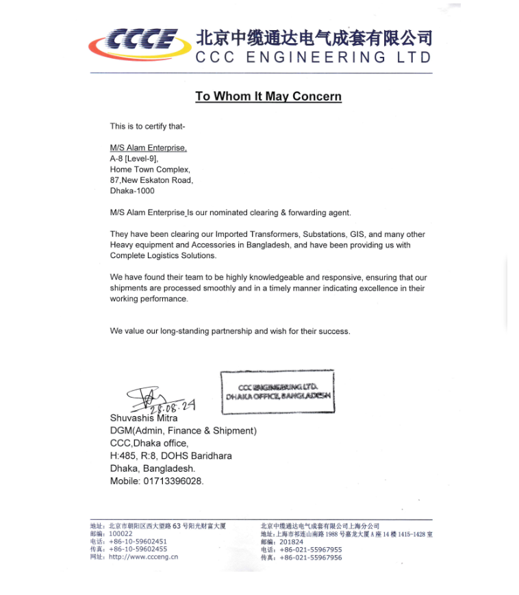 M/S Alam Enterprise was established in 1982 as a proprietorship business entity in Dhaka, Bangladesh. Located in the commercial capital city of Bangladesh which is a major hub for imports. M/S Alam Enterprise has expanded over the years with a presence at all border points of Bangladesh like Chittagong port, Mongla port, Beanpole, Burimari, Hilli, Darshana Land Customs station, as well as Dhaka Airport, Dhaka ICD, DEPZ, CEPZ. While the main office is located in Dhaka, a branch office at port city Chittagong. This expansion coupled with the large network overseas makes us a perfect choice in handling cargo from origin to destination. Read more
